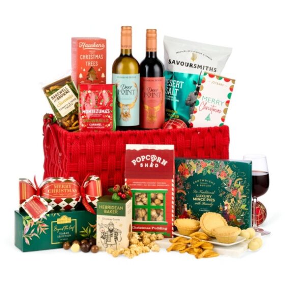 Experience Bulgarian wines with luxury mince pies, premium chocolates and specialty treats in our magnificent large rope basket. Generously filled with exceptional quality products, this festive collection brings warmth and joy to Christmas celebrations with distinguished style. This hamper contains 12 items: Domaine Boyar Deer Point Cabernet Sauvignon 75cl (Bulgaria) Domaine Boyar Deer Point Chardonnay 75cl Cartwright & Butler Luxury Mince Pies with Brandy 330g Hebridean Baker Christmas Cookie 150g Ahmad Tea Beyond The Leaf Teabag Selection 30t/b Montezuma’s Snowballs Caramel 120g Popcorn Shed Christmas Pudding Shed 80g Walnut Tree Christmas Cracker Hazelnuts Covered in Chocolate Hawkens Gingerbread Christmas Trees 115g Bakewell and Browne Tomato & Herb Twists 60g Savoursmiths Dessert Salt Crisps 150g JoyBars Merry Christmas Milk Chocolate Bar 80g Packed in a large rope basket.