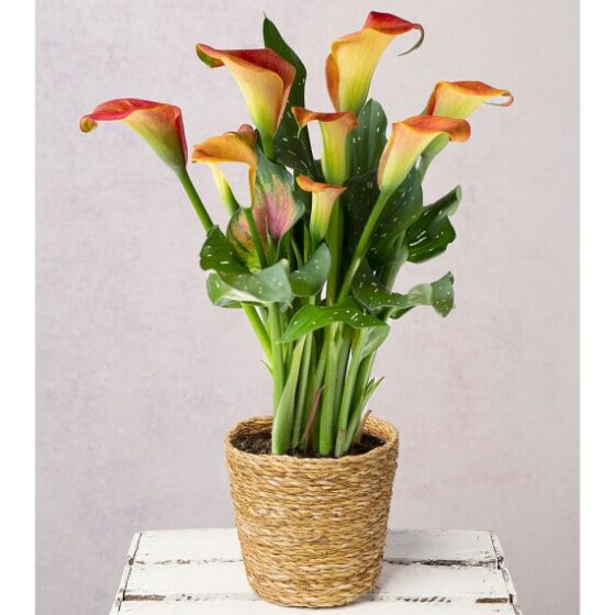 With elegant trumpet-shaped blooms in a cheerful orange hue, this Calla Lily adds a burst of colour to any room. Easy to care for and long-lasting, it makes a thoughtful gift or a delightful treat for yourself. Please note – Colour shade may vary from image due to supply. This plant is considered toxic. Care should be taken to ensure it is not consumed by pets or children. Delivered in a seagrass pot and stands approximately 40-50cm tall.